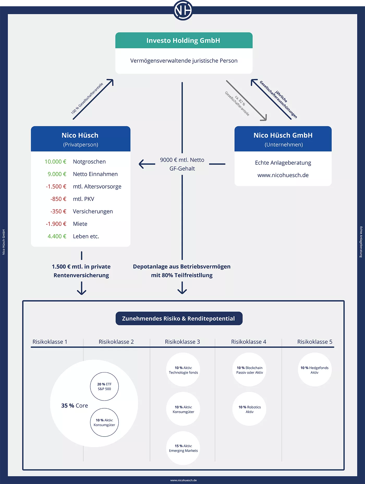 - Bei einer Geldanlage von 10 Millionen Euro sind besondere Vergütungsvereinbarungen möglich und die Betreuung erfolgt über den Geschäftsführer Nico Hüsch persönlich – unter Einbeziehung von Frau Dr. Schoolmann.