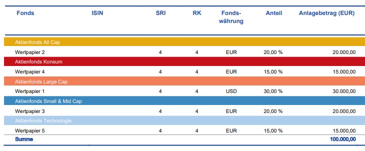Hinweis: Bei folgendem Schaubild ist nur ein moderat defensiver Ansatz bedacht. Selbstverständlich kommen je nach Kundensituation weitere Anlagemodelle dazu. Die meisten unserer Kunden haben zwischen 5 und 10 Anlagefonds in ihrem Gesamtportfolio.