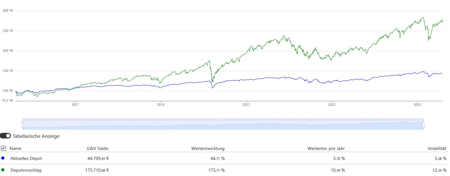 Je nachdem, wie eindeutig das Geld benötigt wird in 10 Jahren, könnten Sie auch ein Modell wählen, dass beide Portfolios (offensiv & defensiv) kombiniert – vorausgesetzt, Sie nehmen gewisse Schwankungsrisiken in Kauf: