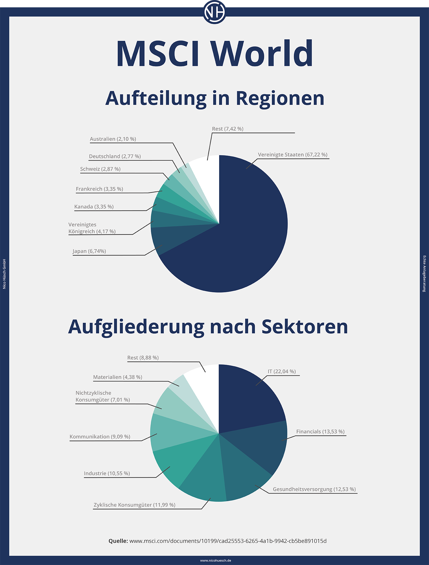 Gut zu wissen: Der bekannteste Welt-ETF, der MSCI World, investiert in die Wertentwicklung von über 1.400 Unternehmen aus 23 Industriestaaten. Daran sieht man: Auch ein einzelner ETF erfüllt die Kriterien eines Portfolios (= Investment in verschiedene Assets), auch wenn man in diesem Fall sagen muss: Eine echte Diversifikation findet beim MSCI World nicht statt.