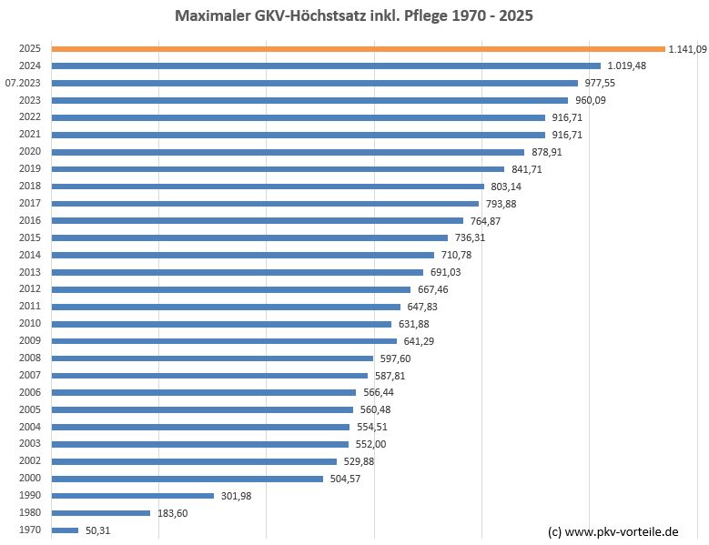 Warum steigt die Jahresarbeitsentgeltgrenze jährlich? Das ist im Grunde nicht verwunderlich. Auch die Höchstbeiträge für die gesetzliche Krankenkasse steigen Jahr für Jahr – wie diese Grafik zeigt: