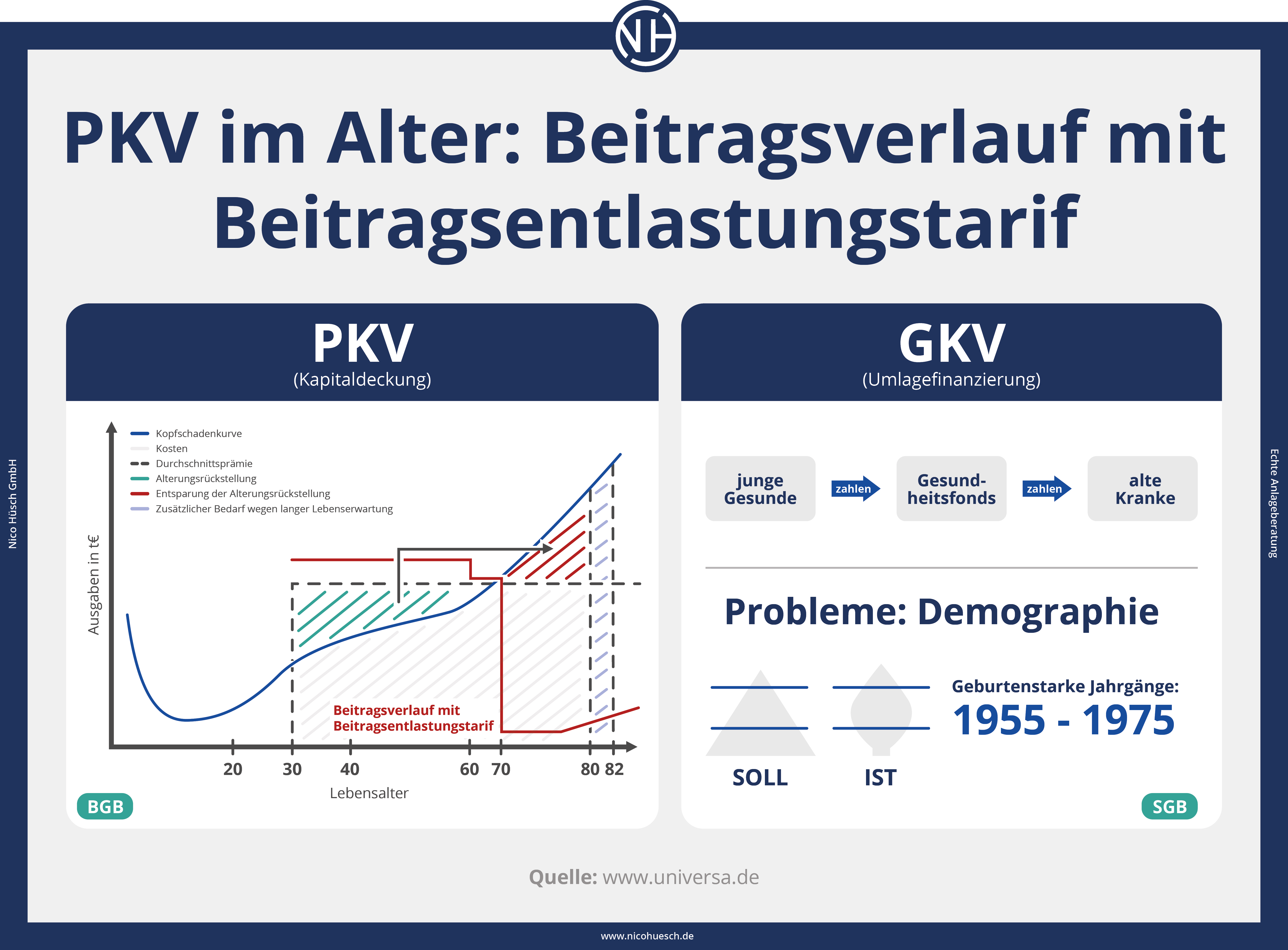 Während die Beiträge der GKV aufgrund der Demografie immer weiter steigen oder über Steuern querfinanziert werden müssen, können die Beiträge in der PKV – mit einem Beitragsentlastungstarif – im Alter sogar deutlich sinken.