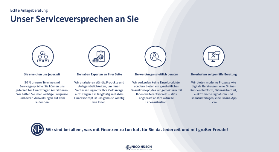 „Im ausführlichen Gespräch ermitteln wir, welche Produkte und Strategien am besten zu Ihren Zielen und Ihrer Lebenssituation passen. Dabei betrachten wir nicht nur die Geldanlage an sich, sondern auch die steuerlichen und strukturellen Vorteile, die z. B. eine Fondspolice (Versicherungsmantel) bietet. Transparenz steht dabei an erster Stelle: Wir erklären Ihnen alle anfallenden Kosten, von den Fonds- und Bankgebühren bis hin zu den Gebühren der Nico Hüsch GmbH – detailliert und nachvollziehbar, damit Sie genau wissen, worauf es ankommt.”