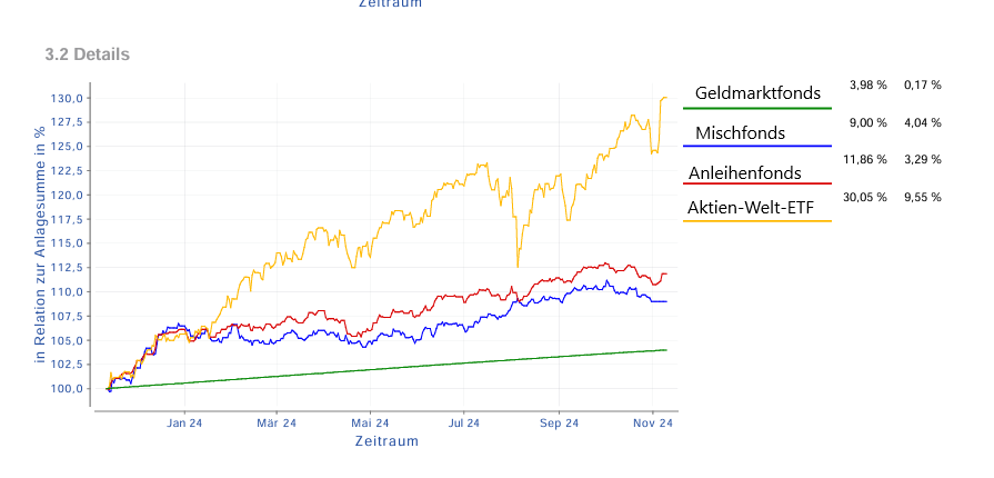 Wir zeigen beim Multi-Asset-Depot nur die letzten 12 Monate, da insbesondere der Geldmarktfonds erst seit August 2023 durch gestiegene Zinsen relevant geworden ist und zuvor kaum Rendite erzielt hat. So stellen wir sicher, dass die dargestellten Zahlen die aktuelle Performance und Marktbedingungen realistisch widerspiegeln.